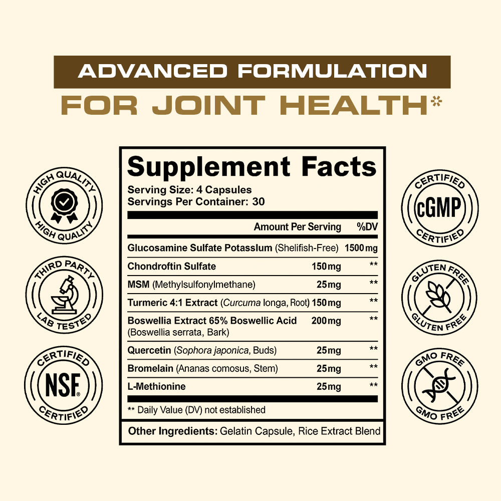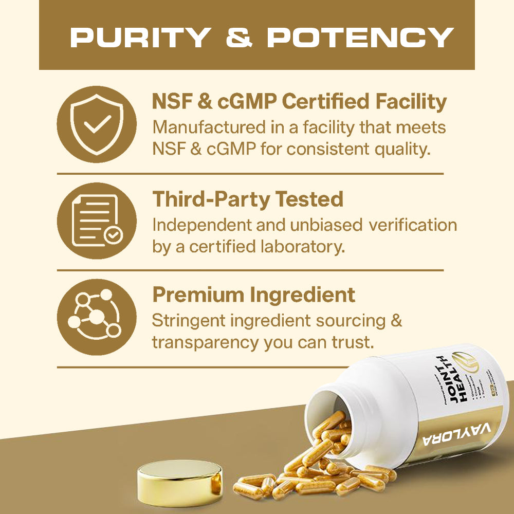 Cada ingrediente está clínicamente probado y verificado por terceros para garantizar pureza, potencia y resultados reales. Esta fórmula apoya la salud articular a largo plazo, una recuperación más rápida y un confort duradero, sin rellenos ni ingredientes innecesarios.